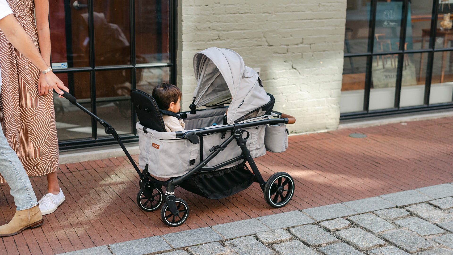Starts as a single seater newborn-ready stroller that quickly and easily converts into a double seater wagon with no tools or conversion kits needed.